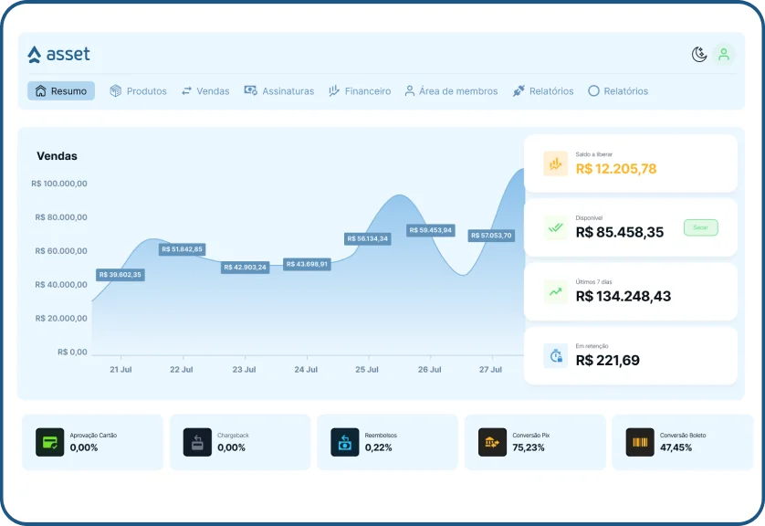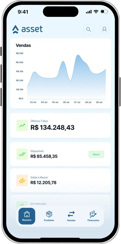Com o aplicativo da Asset, você acompanha suas vendas em tempo real, recebe notificações instantâneas a cada aprovação, monitora faturamento diário e gerencia seus saques com poucos toques tudo com a mesma segurança e estabilidade que você já conhece, agora no seu bolso.